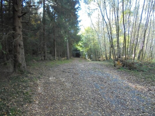 Le sentier descend doucement dans les bois.