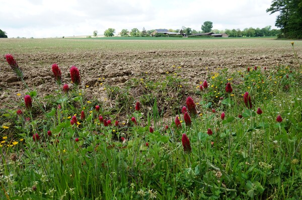 Le chemin longe un champ, et ces épis rouges de trèfles du Roussillon servent de