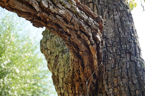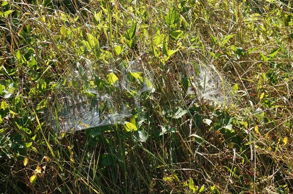 Des araîgnées ont tissé leurs toiles dans la végétation.