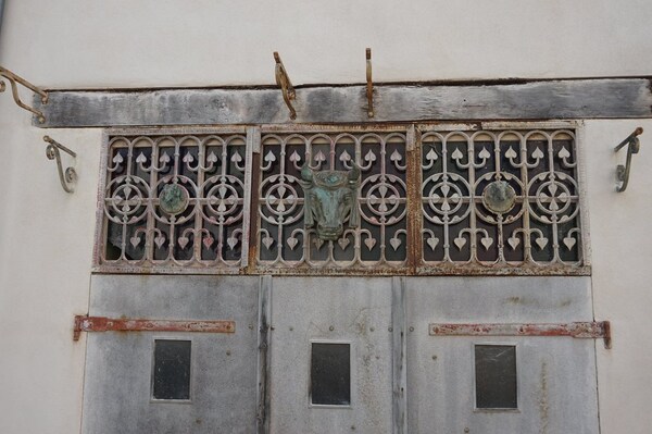 Dans la rue, cette porte de garage est surmontée de têtes d'animaux sculptées.