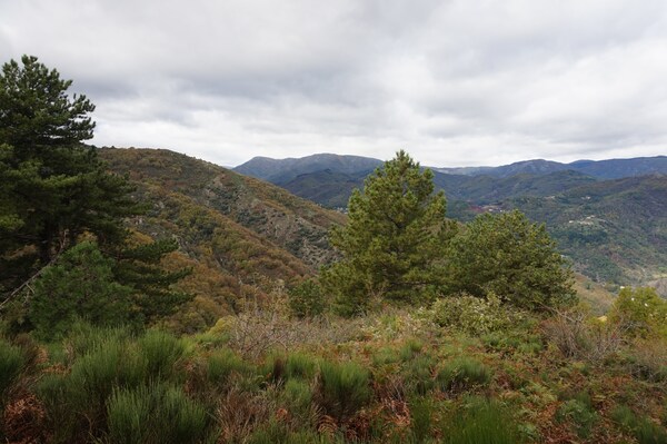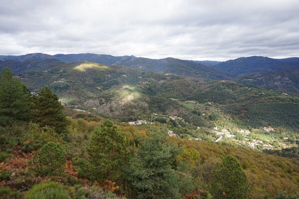 Vers l'est, la vallée de l'Ardèche, et la route de Pont-de-Labeaume (masqué par