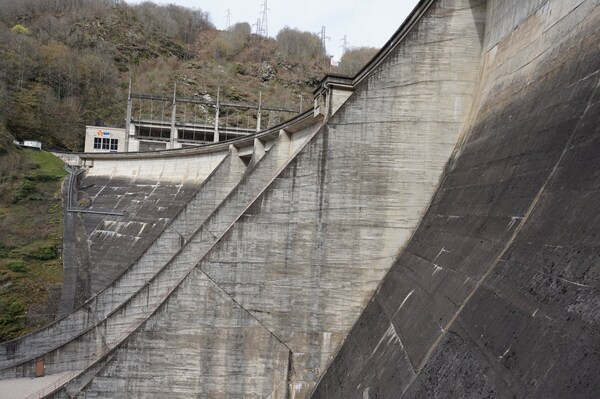 Depuis l'autre extrémité du barrage, vue sur l'aval, avec les évacuateurs de