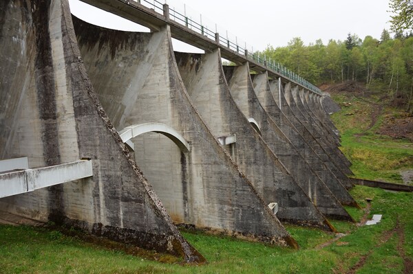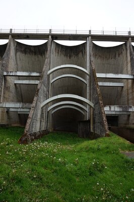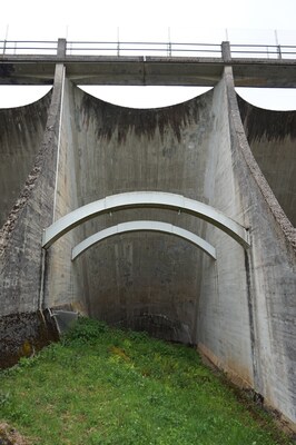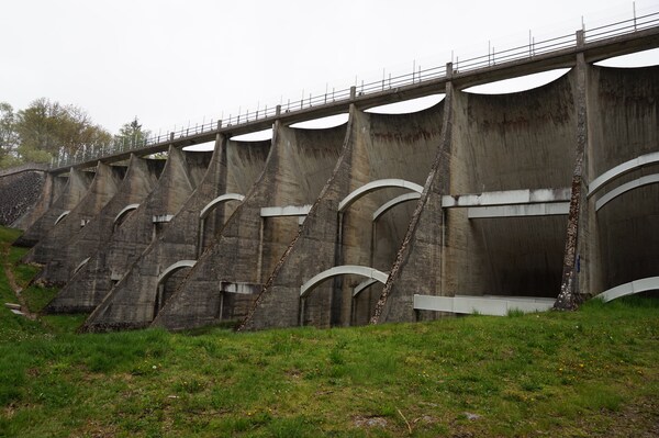 Le barrage, côté aval, vu de profil.