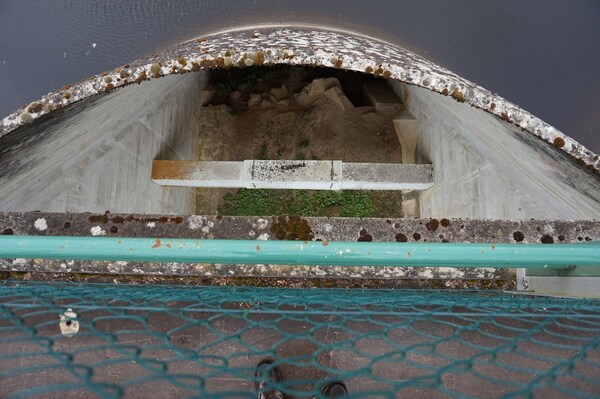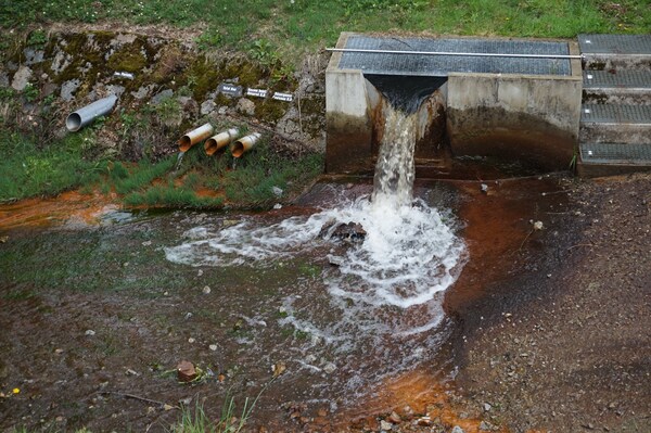 Gros plan sur le déversoir. L'eau est un peu ferrugineuse, semble-t-il...