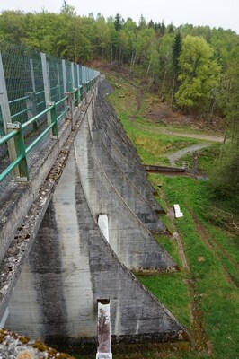 Le barrage, côté lac, vu de profil.