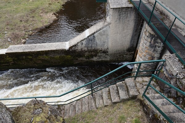 On voit ici le début du canal, entre les marches et le restant du barrage.