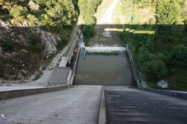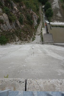 L'aval du barrage, dont le déversoir, vu depuis son sommet.
