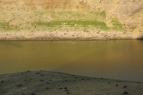 Le lac est tout de même loin d'être vide. Le barrage n'est pas encore visible,