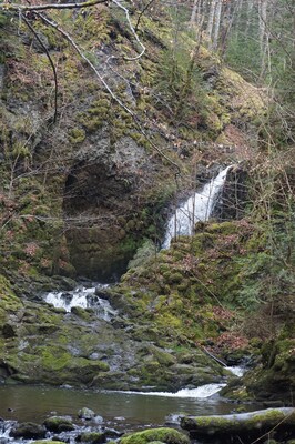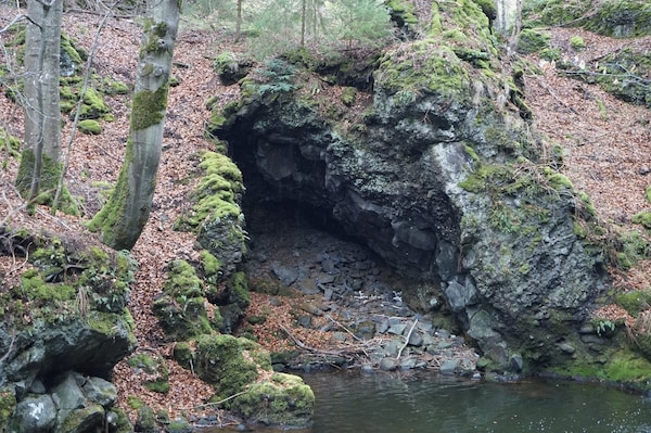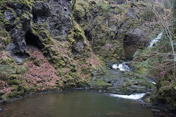 Vue du bassin de la cascade, avec une petite grotte sur la rive opposée.