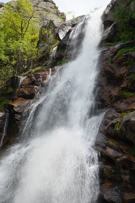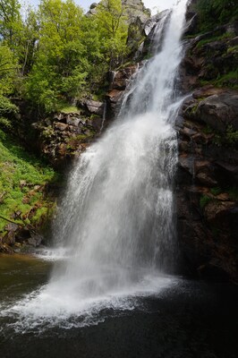 Gros plan sur le sommet de la cascade. On voit bien un épais flux d'eau, à