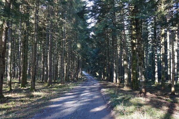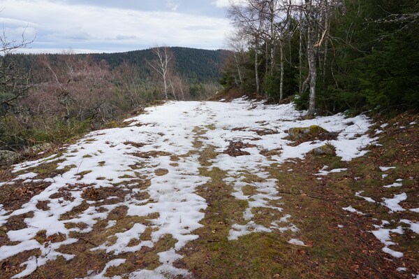 Une large brèche s'ouvre parmi les arbres à gauche du chemin. Sous les nuages,