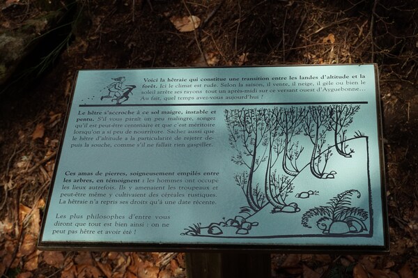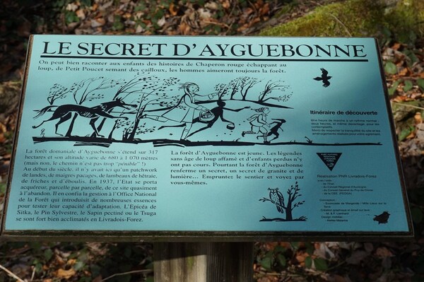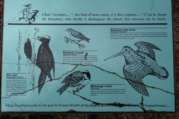 J'atteins la forêt d'Ayguebonne. Le panneau a connu des jours meilleurs...