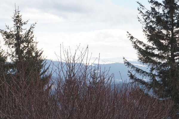 En marchant vers le hameau des Rallières, les reliefs du Forez enneigés sont