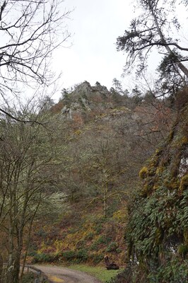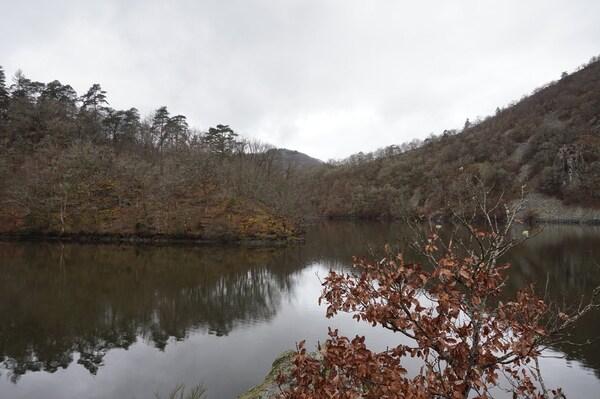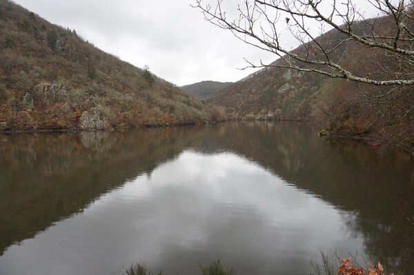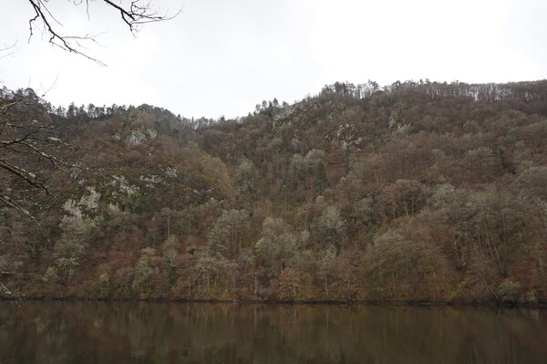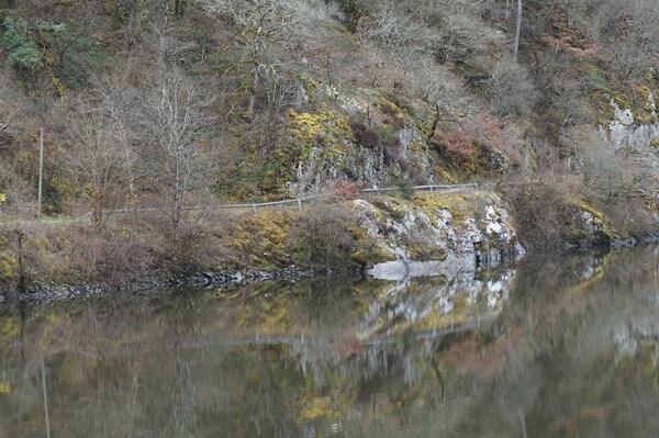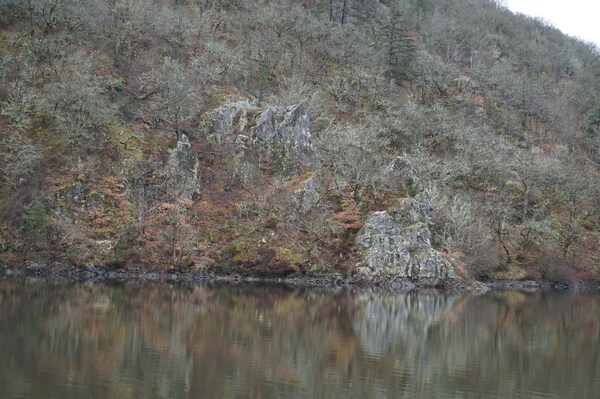 Même d'en bas, les rochers de la rive de Queuille sont visibles.