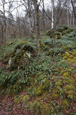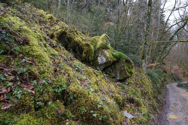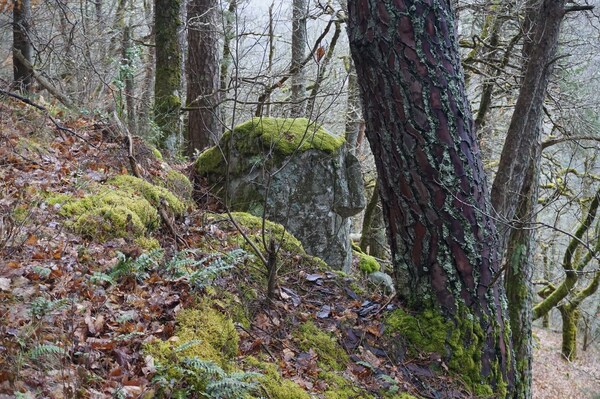 Un peu plus loin, les pierres et les arbres sont envahis par les fougères.