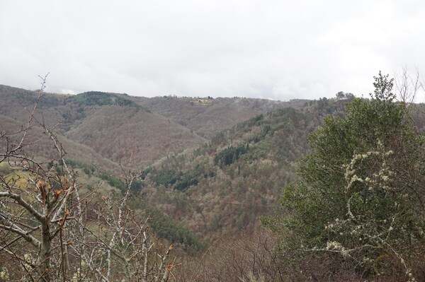 partiellement gâchée par les arbres. Face à moi, Queuille.