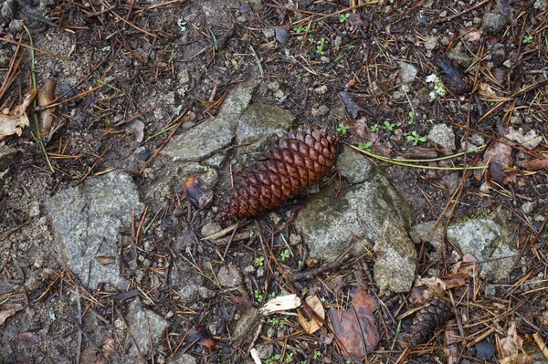 Si j'en crois cette pomme de pin au milieu du sentier, le temps est humide et le