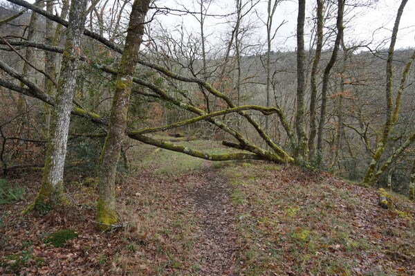 Par endroits, des arbres menacent de s'effondrer sur la piste.