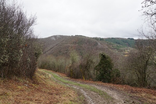 La piste arrive au bout de l'« estuaire » du ruisseau de Queuille, et oblique