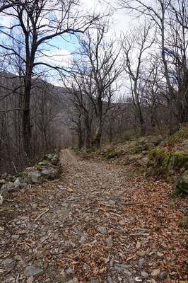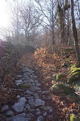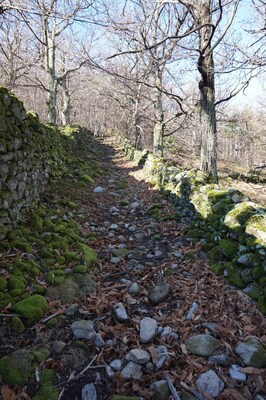 Le chemin s'élève entre des murets, sur un sol très pierreux et recouvert de