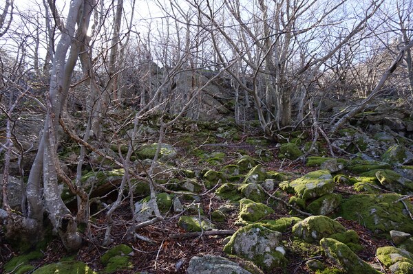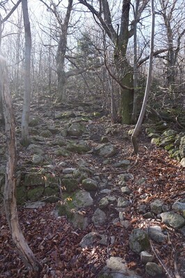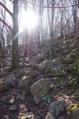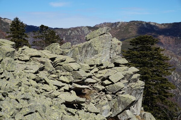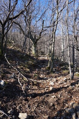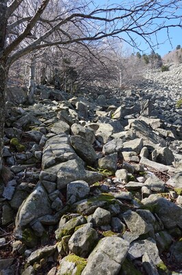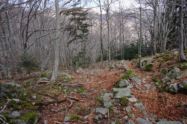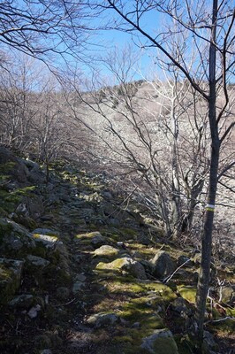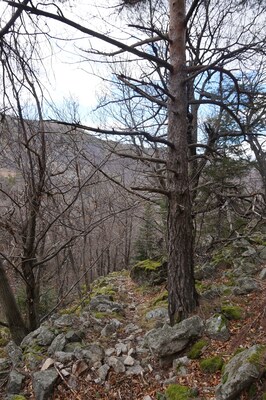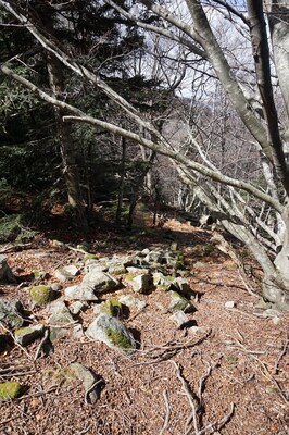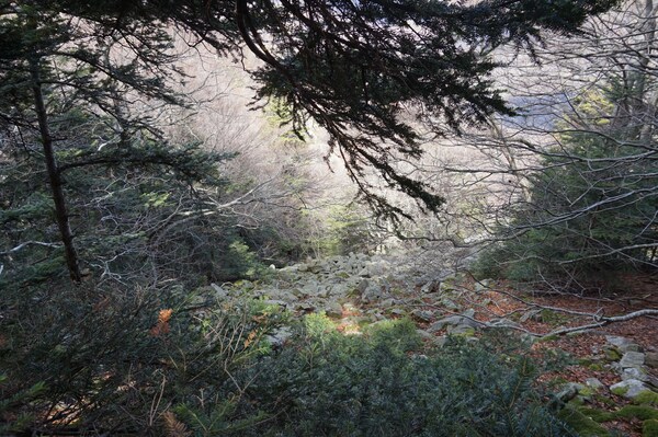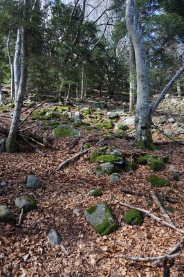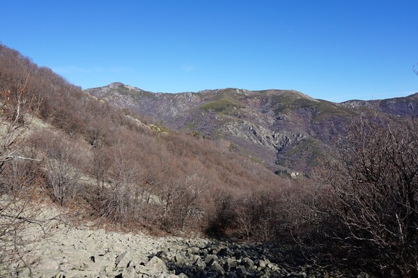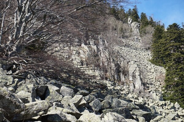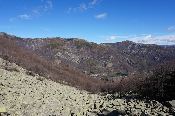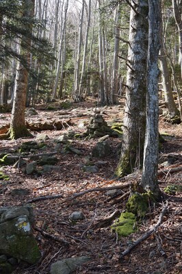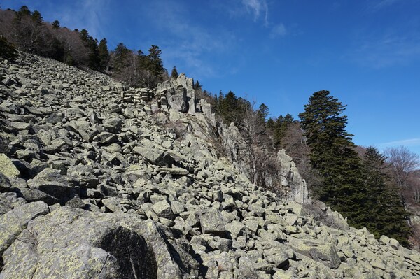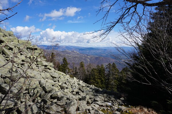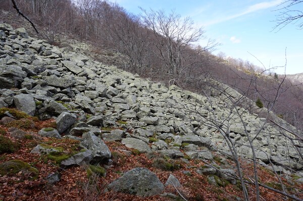 Bien que boisé, ce versant du Petit Mont Aigu reste très pierreux...
