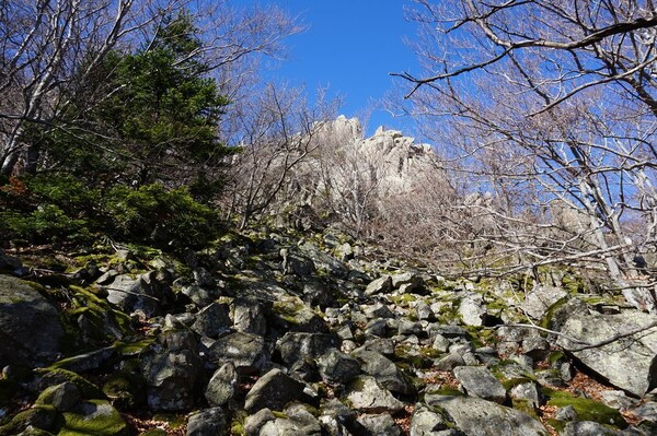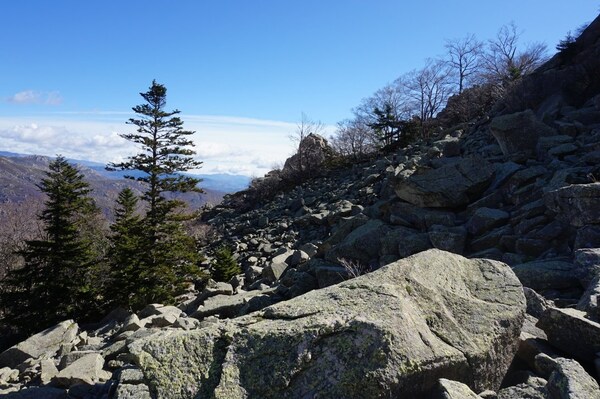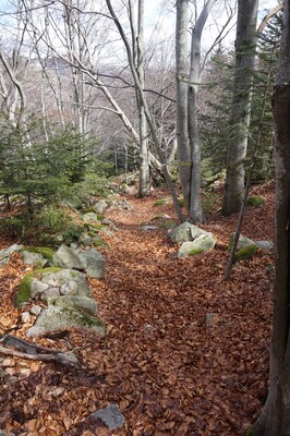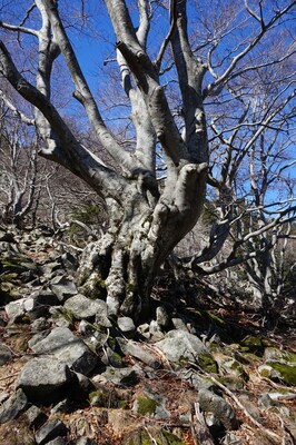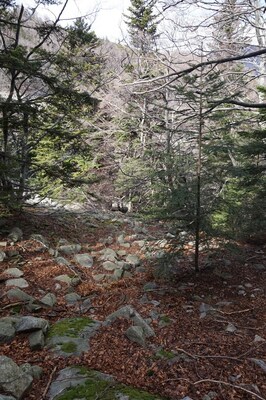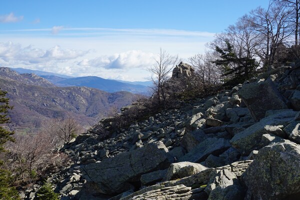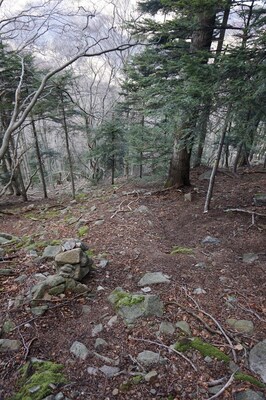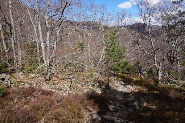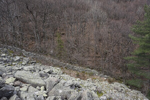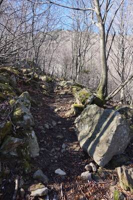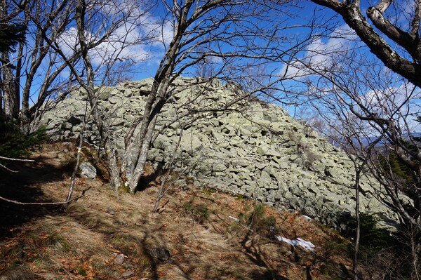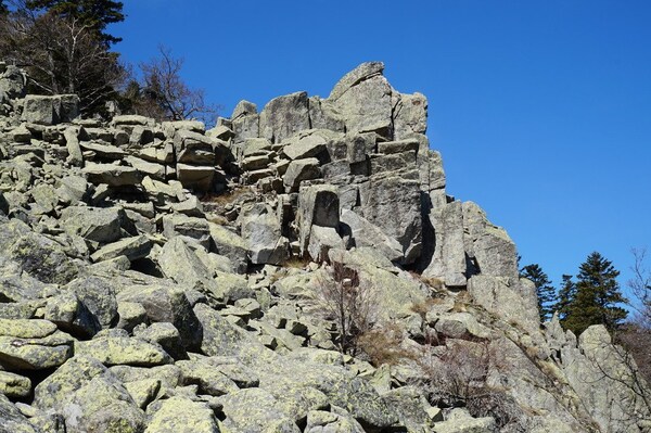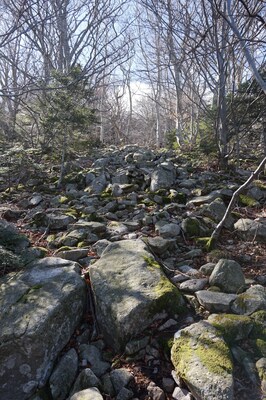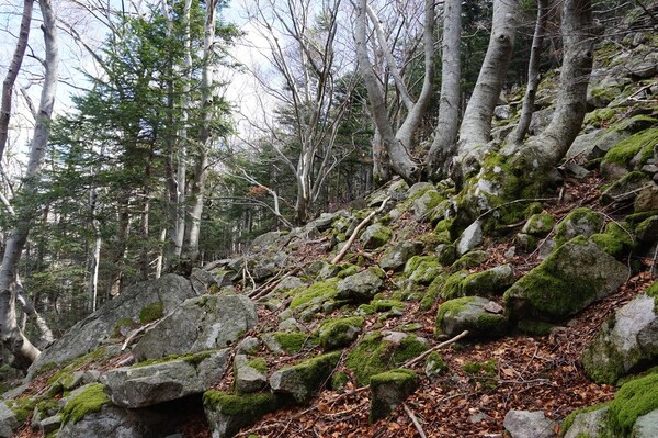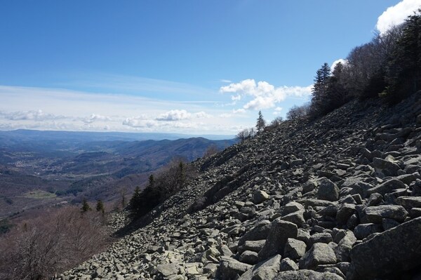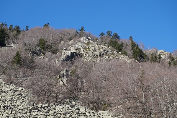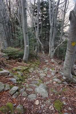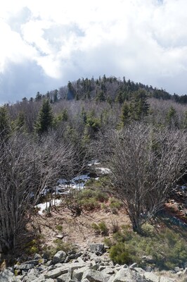 Bien que boisé, ce versant du Petit Mont Aigu reste très pierreux...