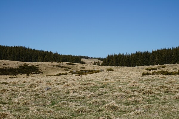 Vue en arrière. Tout à gauche, au bord de la forêt, le buron de Peyre