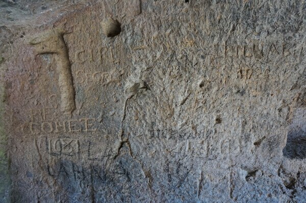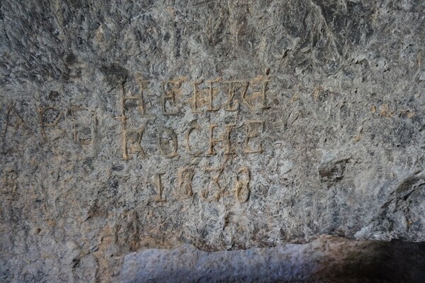 L'une des parois est gravée de nombreuses inscriptions plus guère lisibles. Je