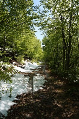 Le sentier, assez étroit, monte doucement parmi les arbres. Après être monté un