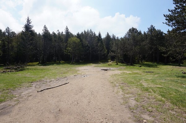 La piste arrive à une large bifurcation. Des poteaux indicateurs sont disposés