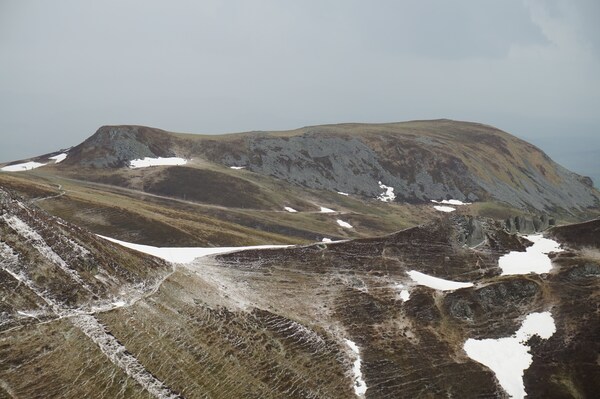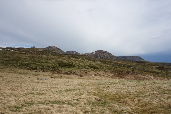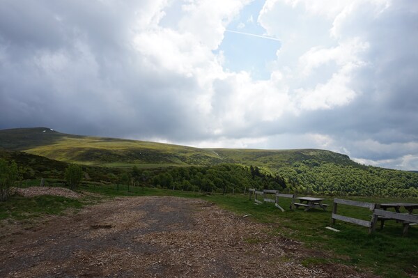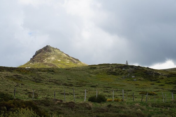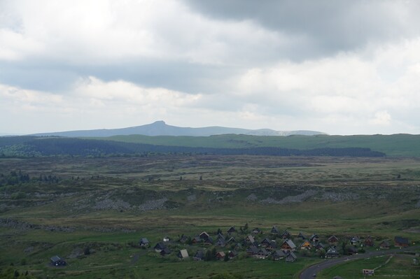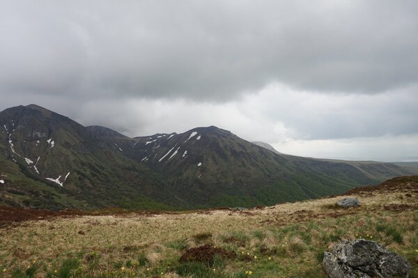 Devant la Banne d'Ordanche, la silhouette aplatie de la Montagne de Bozat,