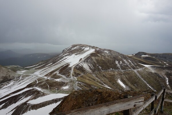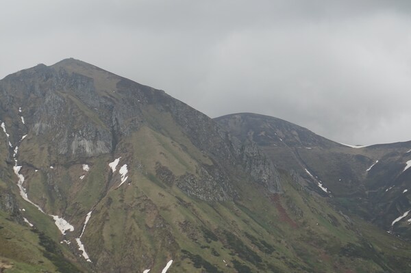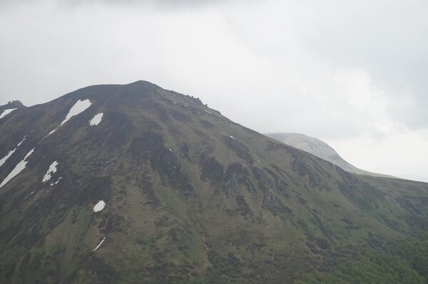 Le Puy de Sancy, et à sa droite, le Puy Ferrand dans les nuages. Tout à