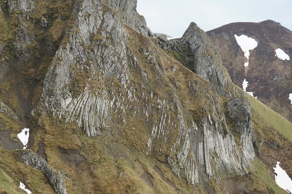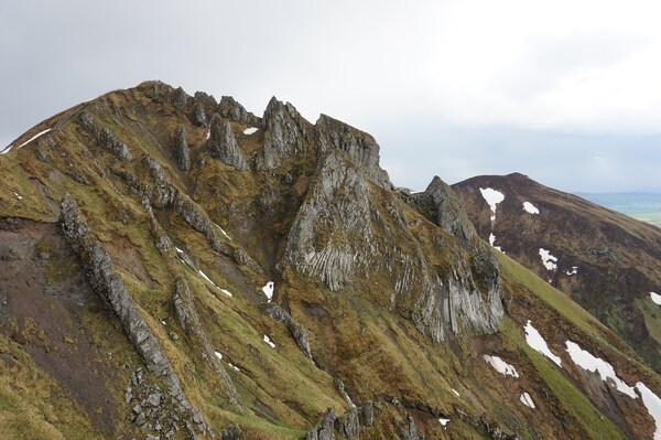 Le Puy de Sancy vu depuis le nord, avec les Aiguilles du Diable et leurs orgues