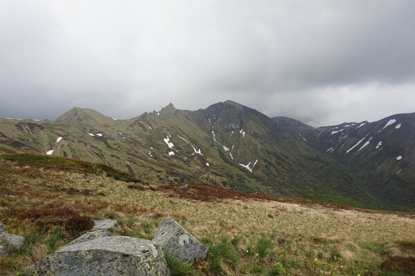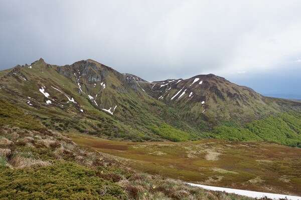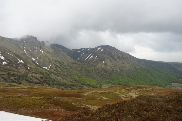 À gauche, le Puy Ferrand ; au centre, le Puy de Sancy partiellement masqué