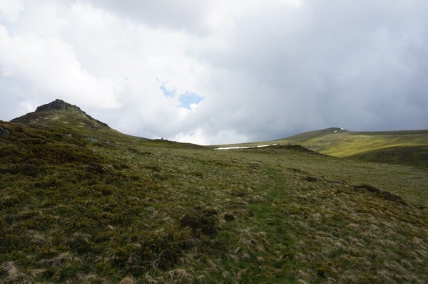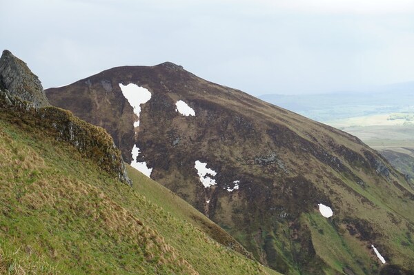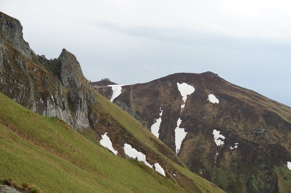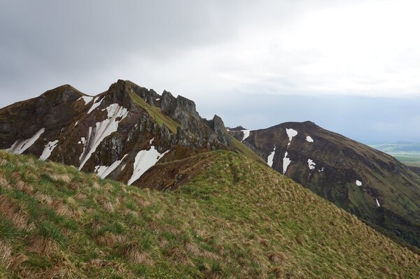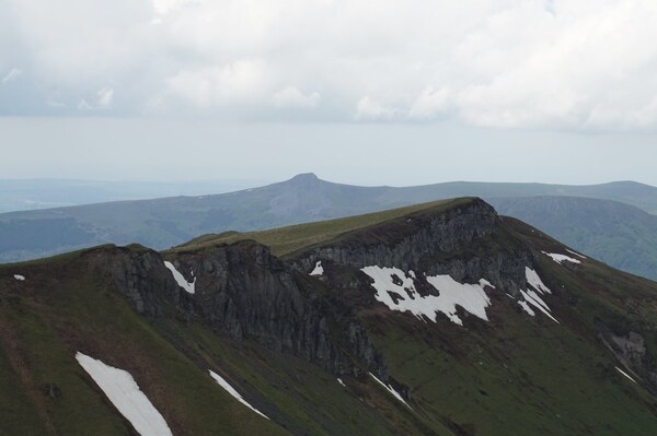 Le sommet du Puy de la Chabane, à gauche ; et l'omniprésent Puy de Sancy, à