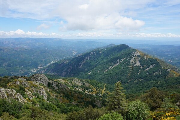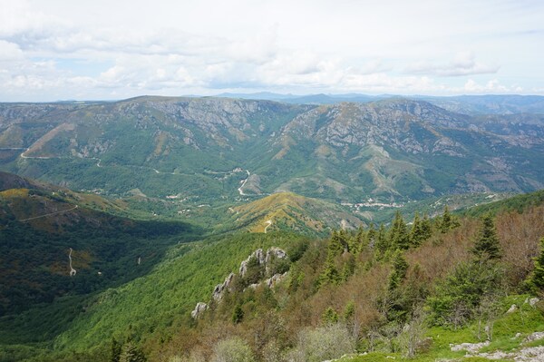 La haute vallée de l'Ardèche vue depuis le Rocher des Taillades. On distingue