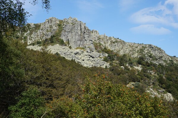 Une trouée parmi les arbres m'offre une vue sur le Roc des Échelles. Tout à