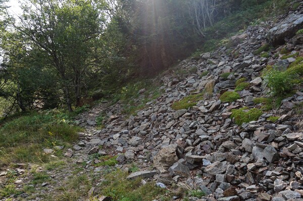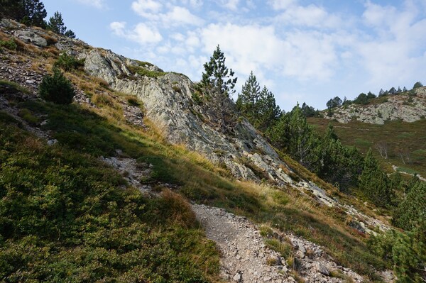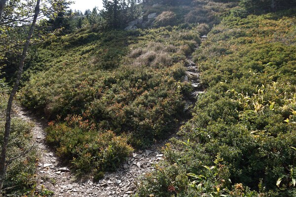 Le chemin monte en lacets et s'apprête à traverser le pierrier.