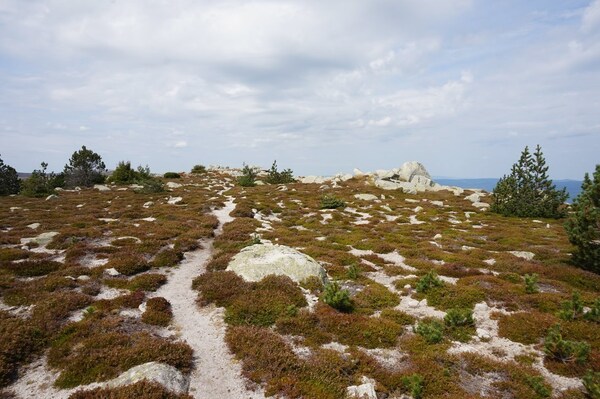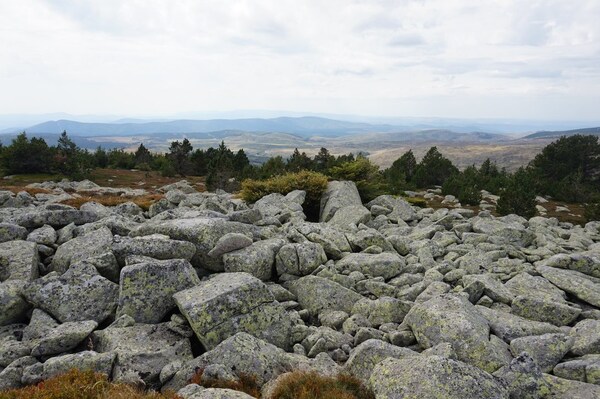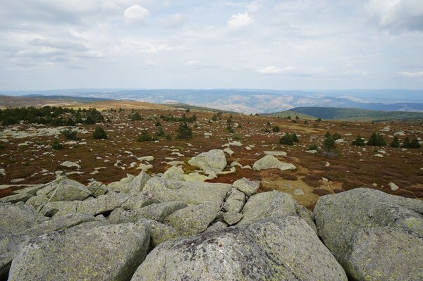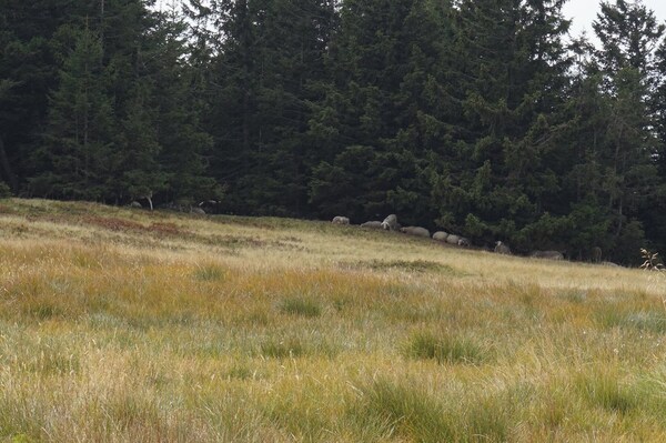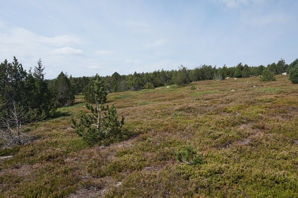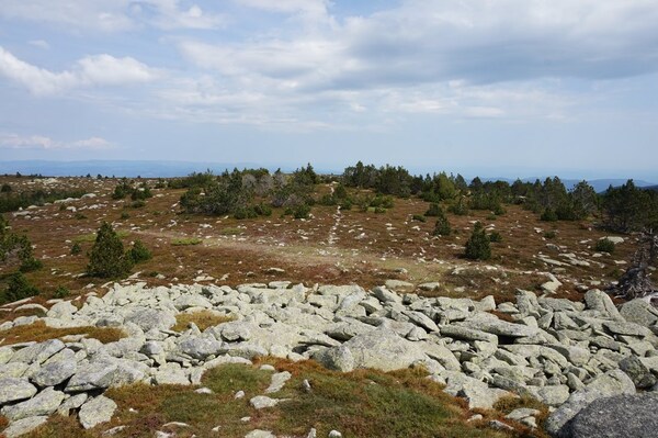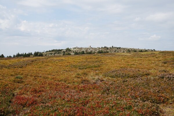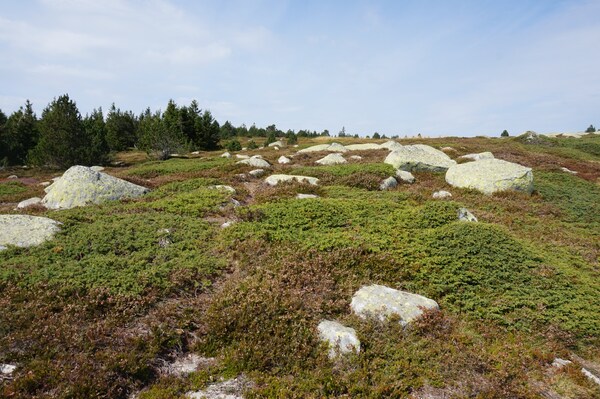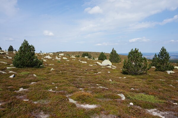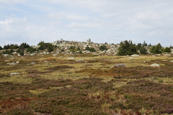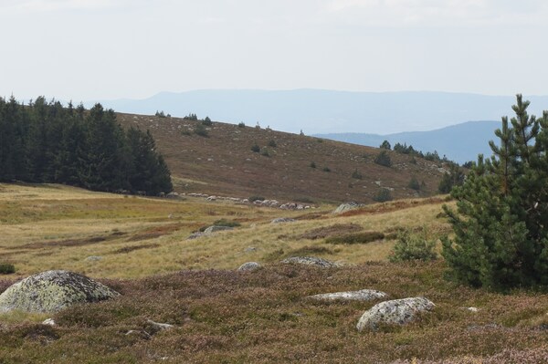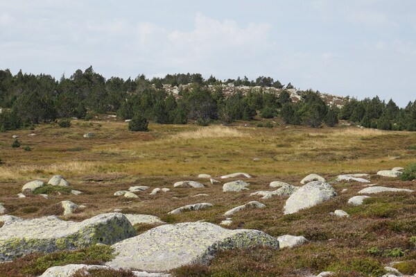 Tout autour de moi, hors sentier, s'étend une prairie de genêts, myrtilliers, et