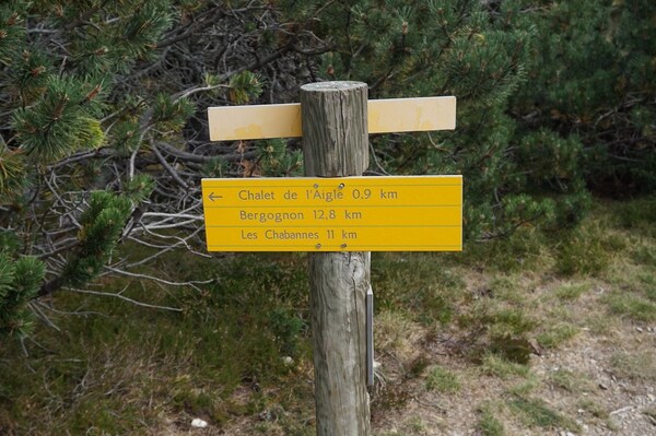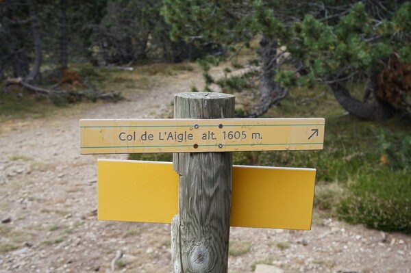 En contrebas, ce poteau indicateur sert également de support aux oiseaux