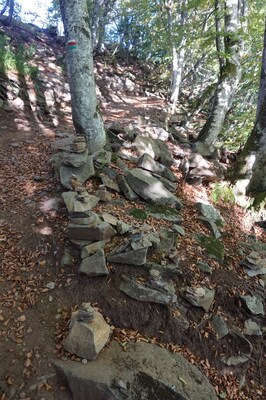 Le chemin monte assez fortement au milieu des racines des arbres mises à nu.