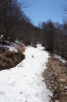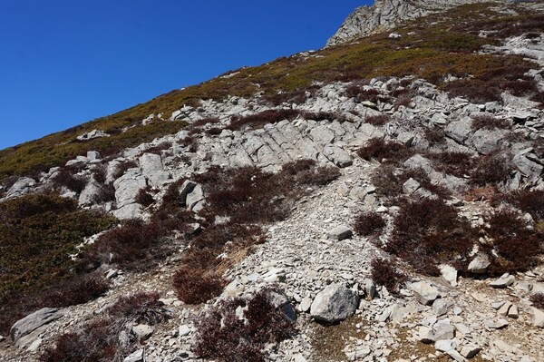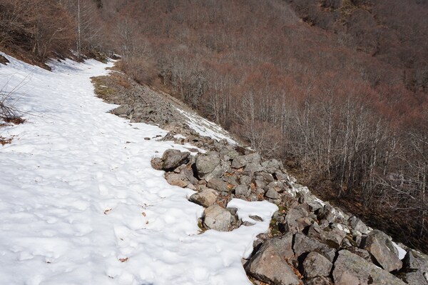 Le chemin traverse un pierrier sur quelques dizaines de mètres, mais la neige le