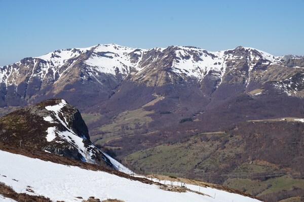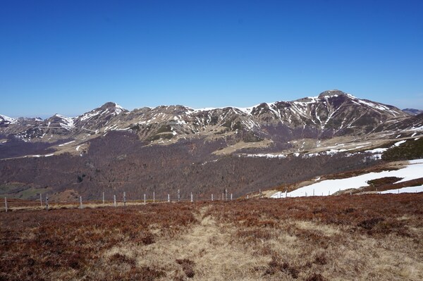 Sur la droite, superbe vue sur la crête du Plomb du Cantal (à droite de l'Arpon