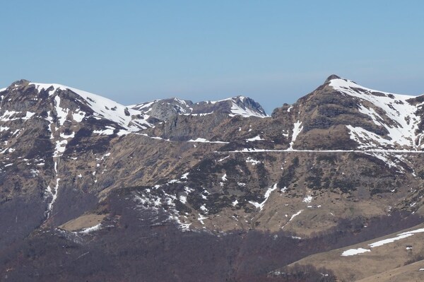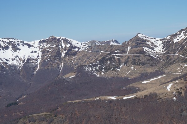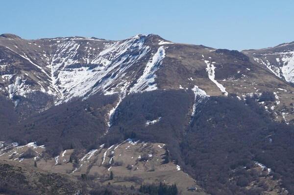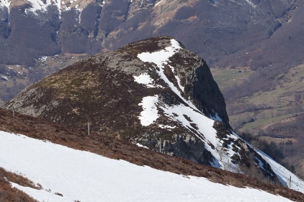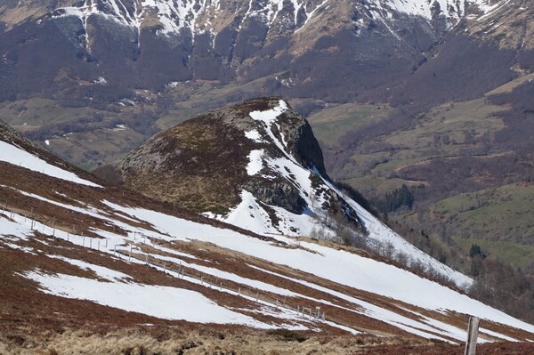 droite, le Puy de la Cède, sous lequel ce trait blanc de neige est le tracé de