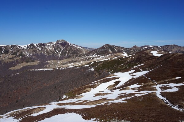 La partie centrale de la crête du Plomb du Cantal, centrée sur le Puy Brunet. De