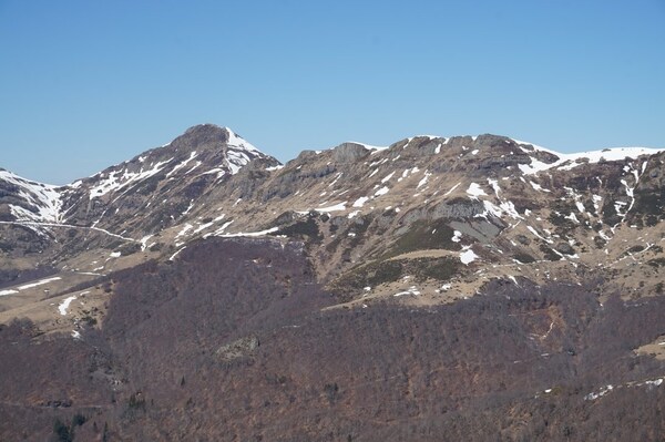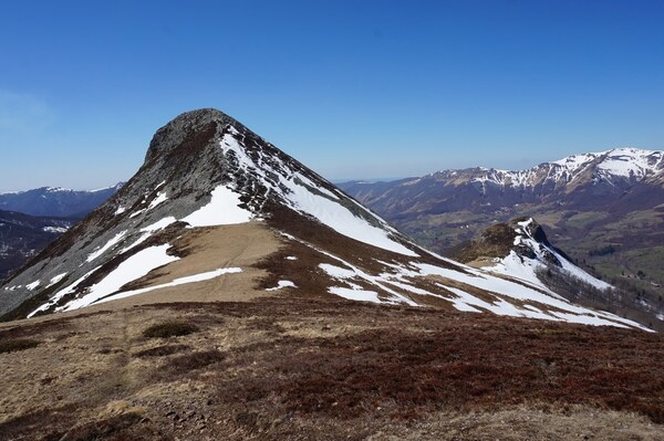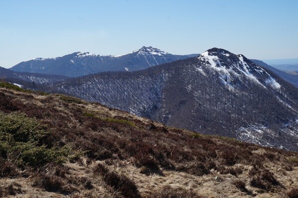 Gros plan sur le Plomb du Cantal et le Puy Brunet, avec l'Arpon du Diable