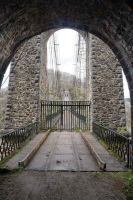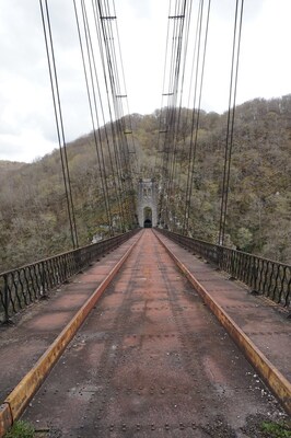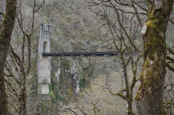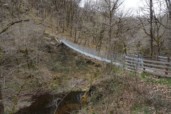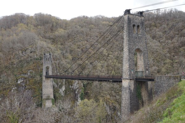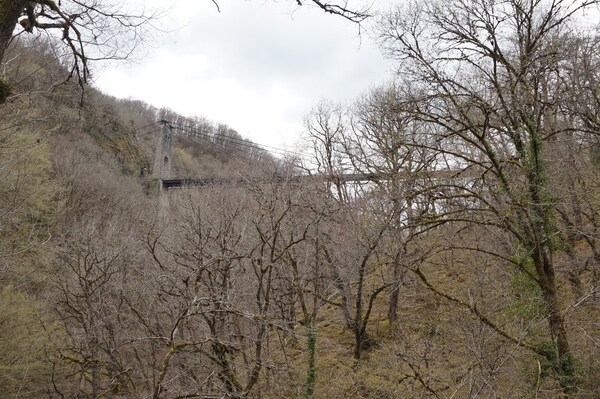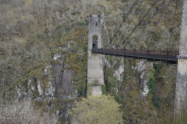 Le franchissement de la Luzège s'effectue par une passerelle himalayenne, les