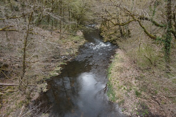 Vers l'aval, le tablier du viaduc est discernable derrière les arbres.