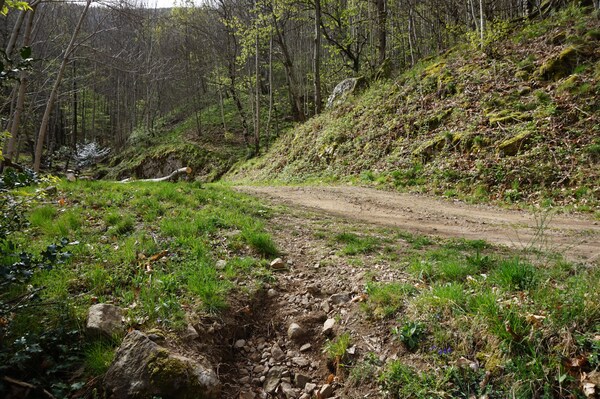 Après avoir franchi le ruisseau a gué, le chemin continue sur la rive opposée...