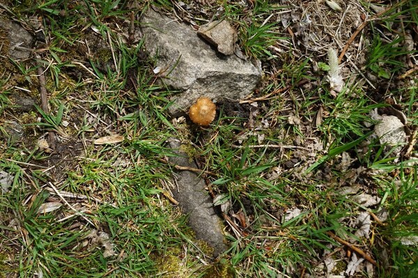 Je découvre un champignon esseulé, protégé par une pierre.